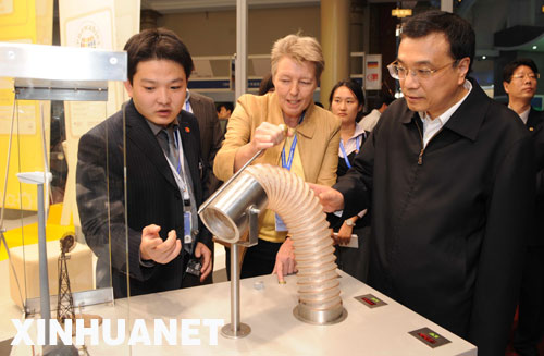 在工业节能、建筑节能等展区,李克强兴致勃勃地观看了太阳屋、抗震节能屋以及目前国内单机最大的2兆瓦风力发电机组等技术和设备。他指出,节能环保关键靠创新,要大力发展新能源和替代能源,狠抓科技成果推广应用,提高科技进步对节能环保的贡献率。还要通过抓紧理顺重要能源资源产品的价格关系、完善经济政策和法规标准,为节能环保提供制度保障。